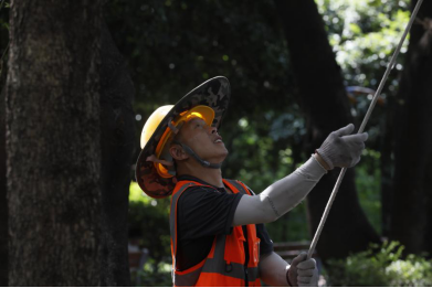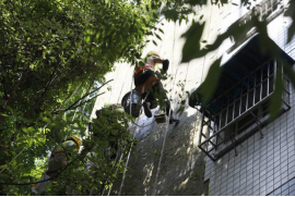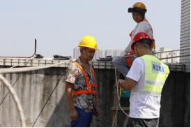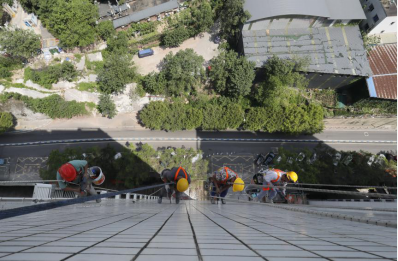 10:16,另一棟樓的天臺,經(jīng)過連日的高溫烘烤,難得的庇蔭處也燥熱難耐。安全監(jiān)督員小陳仔細(xì)檢查每一條承重吊繩的卡扣是否牢固,反復(fù)測試安全鎖的鎖止力度。他介紹到,“高溫會加速金屬部件氧化,每一個卡扣都可能成為生命線的關(guān)鍵節(jié)點(diǎn)。”不遠(yuǎn)處,老趙踩著木梯微微前傾,將電鎬穩(wěn)穩(wěn)遞向空中,小費(fèi)伸手接過時,手柄上早已覆上一層細(xì)密的汗珠。兩人的目光在高差中交換,像是完成了一個無需言說的暗號。全員互道“就緒”的話音剛落,“蜘蛛人”小分隊(duì)便抓牢繩索,伴著輕微的滑輪轉(zhuǎn)動聲緩緩下降,正式開啟他們今天的第二輪作業(yè)。
