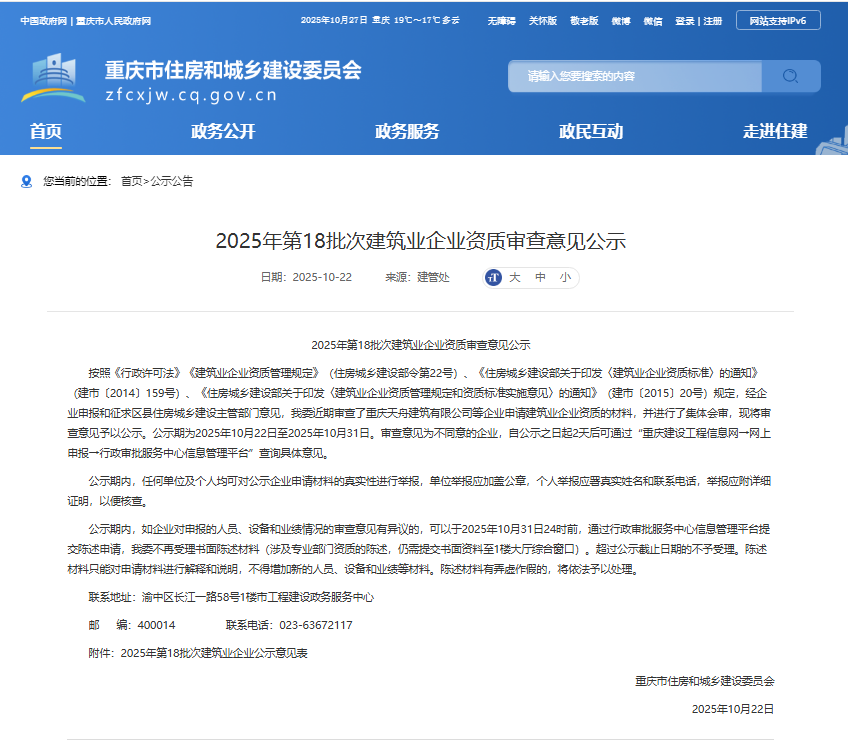 近日,重慶市住房和城鄉(xiāng)建設(shè)委員會正式發(fā)布《2025年第18批次建筑業(yè)企業(yè)資質(zhì)審查意見公示》,重慶兩江新區(qū)建設(shè)有限公司申報的建筑業(yè)企業(yè)資質(zhì)已通過市級主管部門的嚴(yán)格審查,進入公示階段。